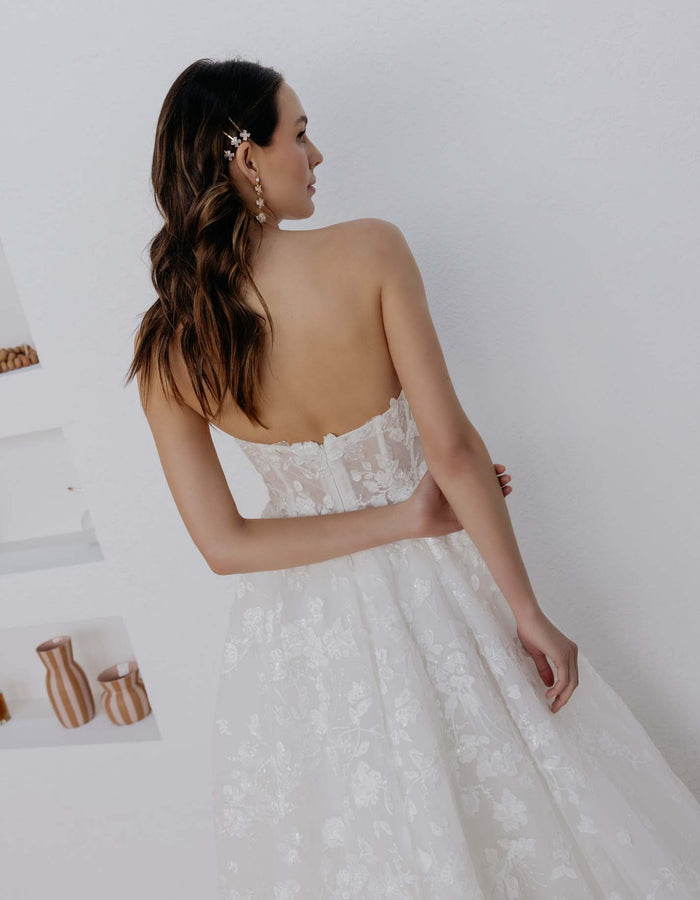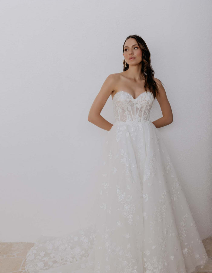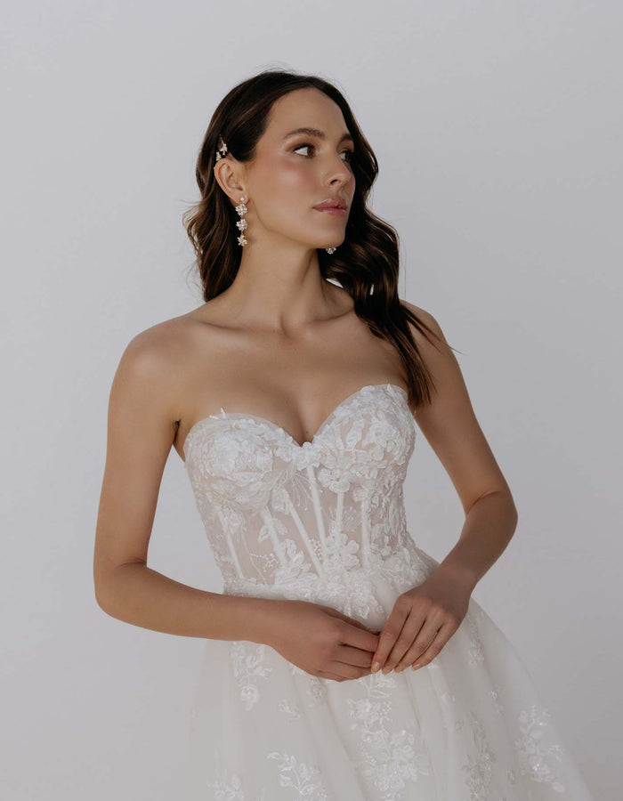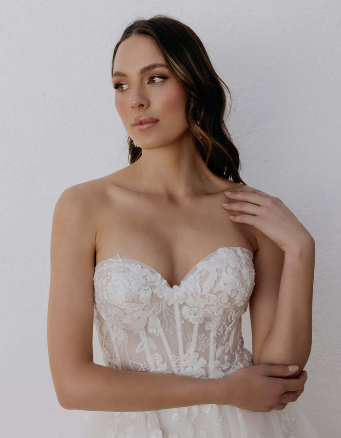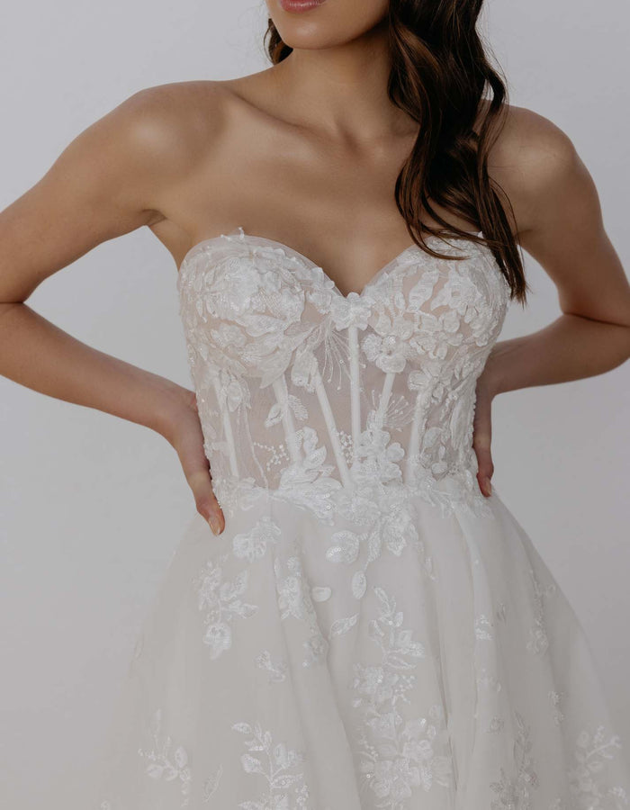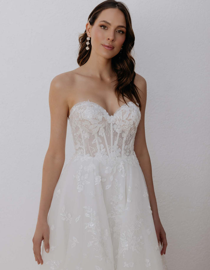 Fit: A-line gown. Strapless sweetheart neckline on a boned bodice to hug the torso.
