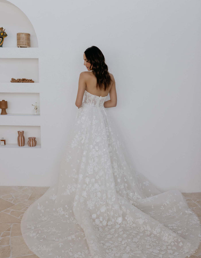 This gorgeous design grabs your attention immediately, but there is more to it than meets the eye. The stunning floral design covers the full skirt and dramatic train, making sure your entrance is one to remember.