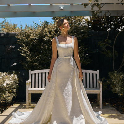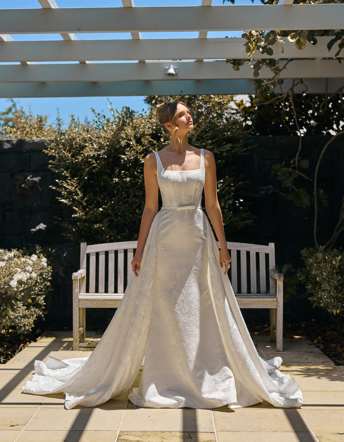 Crafted with floral organza fabric, Perry is not a dress you will come across often. Featuring a square neckline and a fitted bodice with boning detailing. The skirt is fitted at the waist accentuating your curves. The dress features a statement bow, belt and overskirt which are all detachable making the dress versatile. From simple to dramatic this dress will give different looks throughout your wedding day.