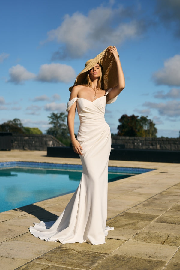 With a crisscross sweetheart neckline, the Priscilla can be worn strapless or with delicate draping off-the-shoulder sleeves adding a romantic touch for the figure fitting silhouette.