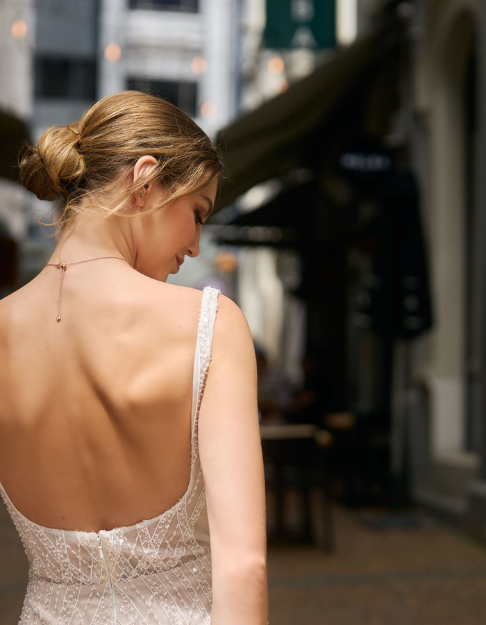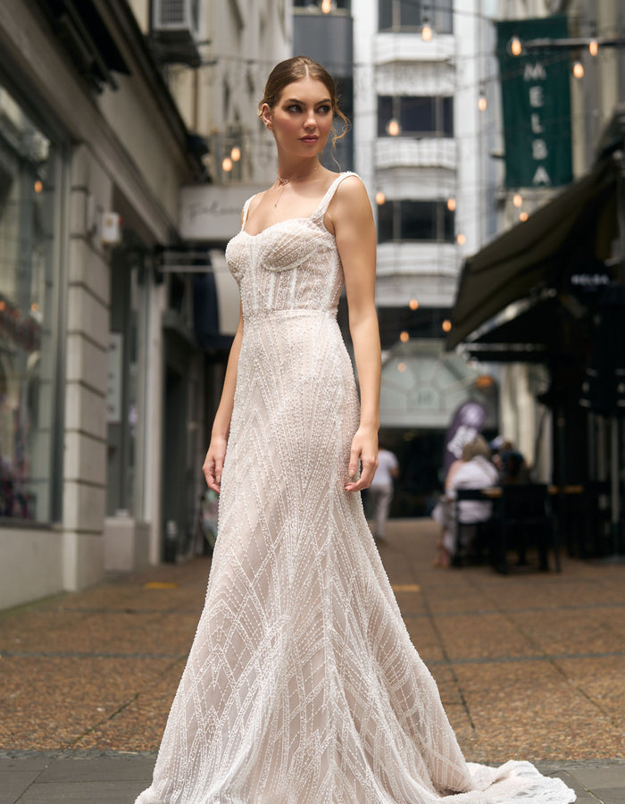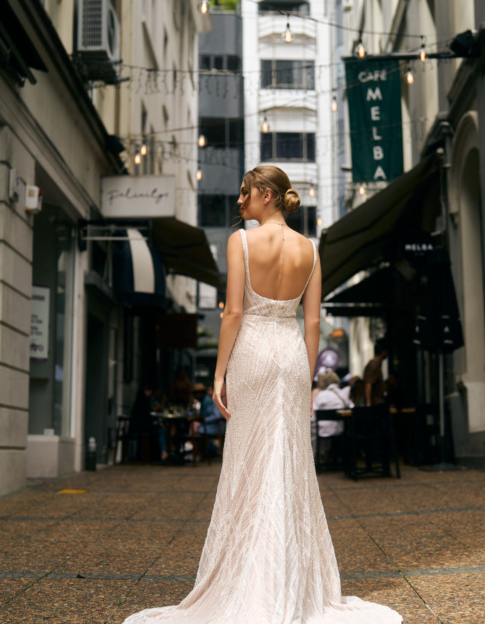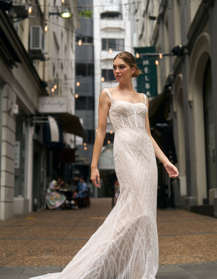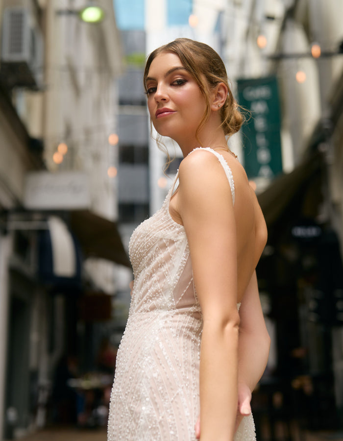 Modern and effortlessly refined, the Reid gown is a luminous celebration of structure and sophistication.