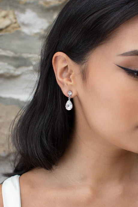 A bridal classic for your special day, Rosemary features a genuine Swarovski pear shape crystal set by hand. These two make a pretty pair for the bride who wants a delicate sparkle.