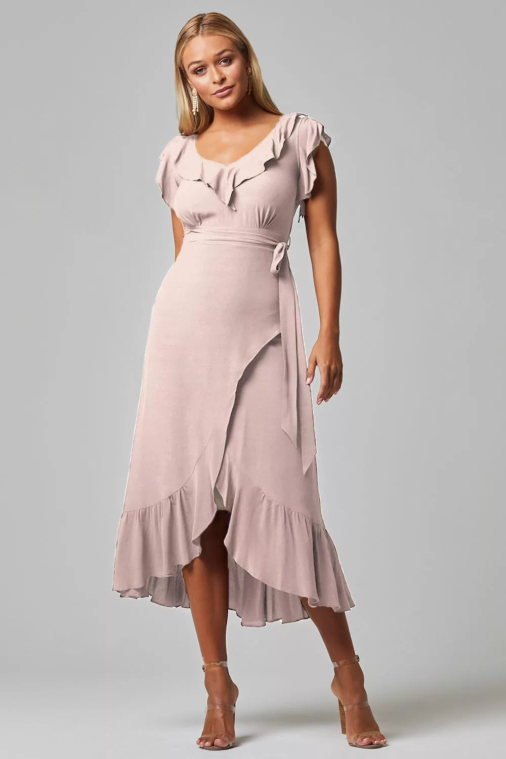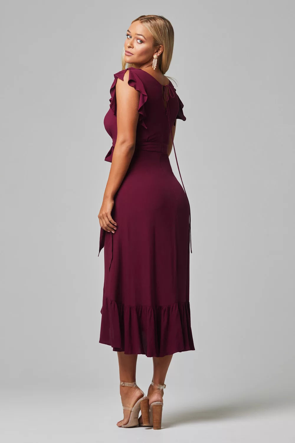 The Ruby bridesmaid dress by Tania Olsen Designs is the answer to spring and summer outdoor weddings! The Ruby is a faux wrap style and features a modest, high v neckline paired with dainty, ruffle cap sleeves.