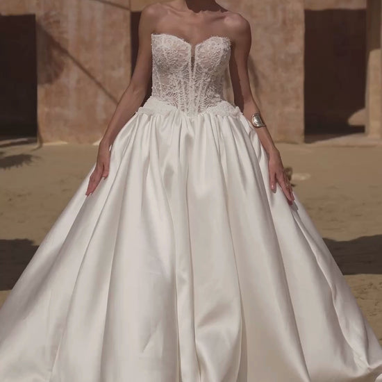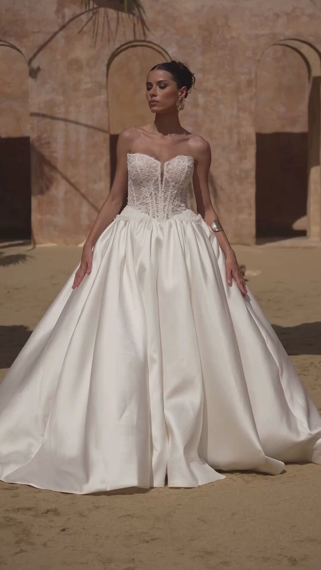 A subtle Basque waist enhances the figure before flowing into a dramatic pleated skirt in luminous Mikado . Sasha is designed for the bride who feels powerful and poised.