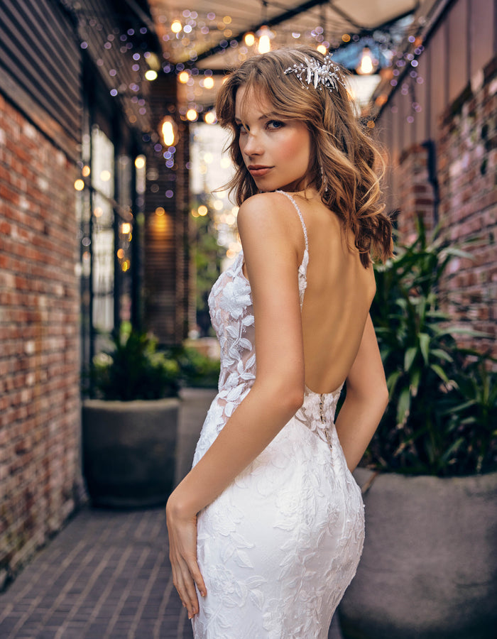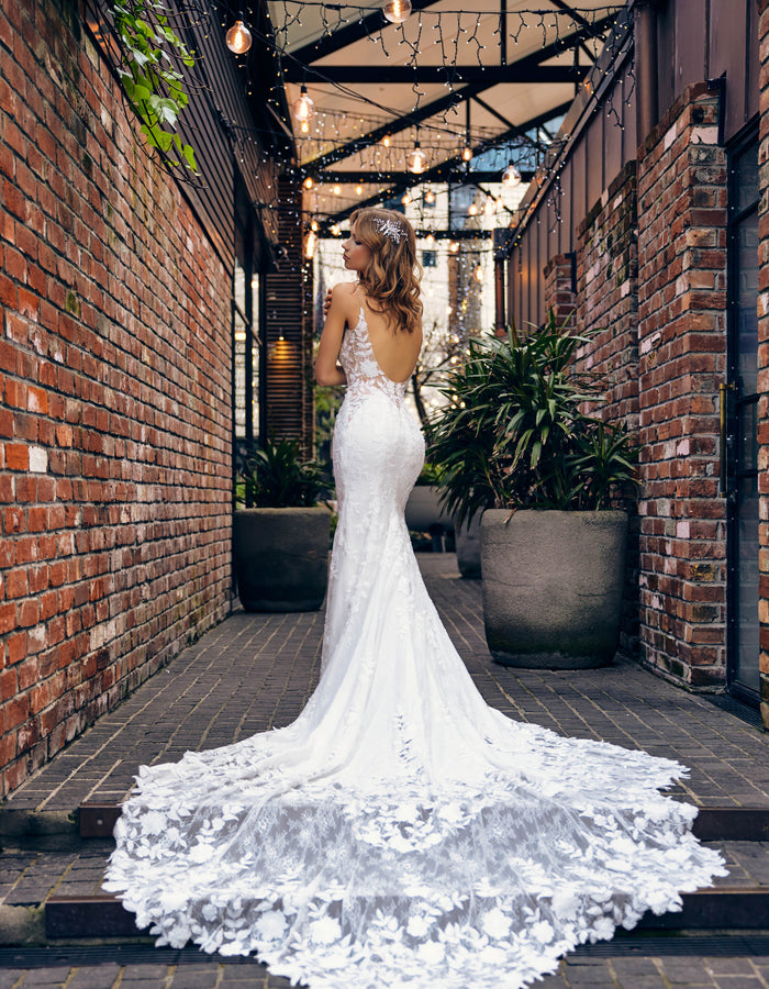 Featuring a stunning full lace train, Shawnee showcases a sheer V-plunge neckline with a subtle sweetheart touch. With intricate lace leaf detailing embellishing the design, a sheath style silhouette and a low back to compliment the show stopping train.