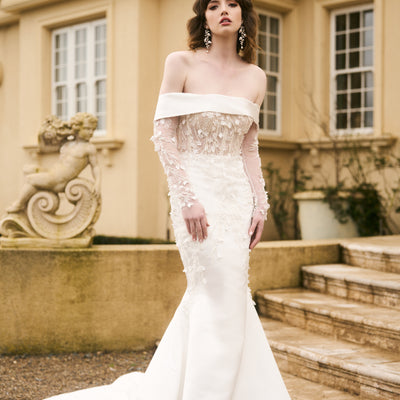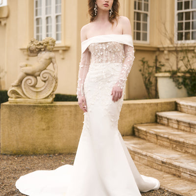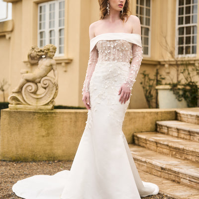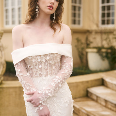 The Jessica Couture Theia Sleeves are a fitted sheer sleeve designed to fit seamlessly under an off-the-shoulder neckline. Decorated in our most popular lace from our Olga gown - floral lace with 3D leaves and flowers, they are a delicate touch to your bridal gown.